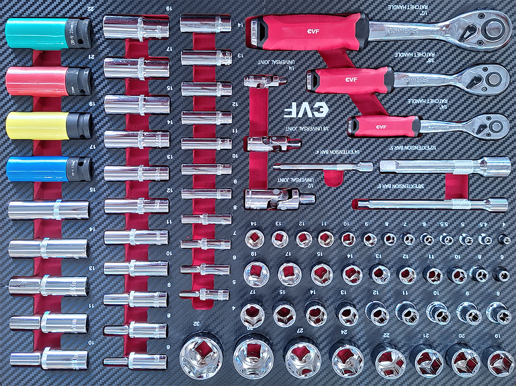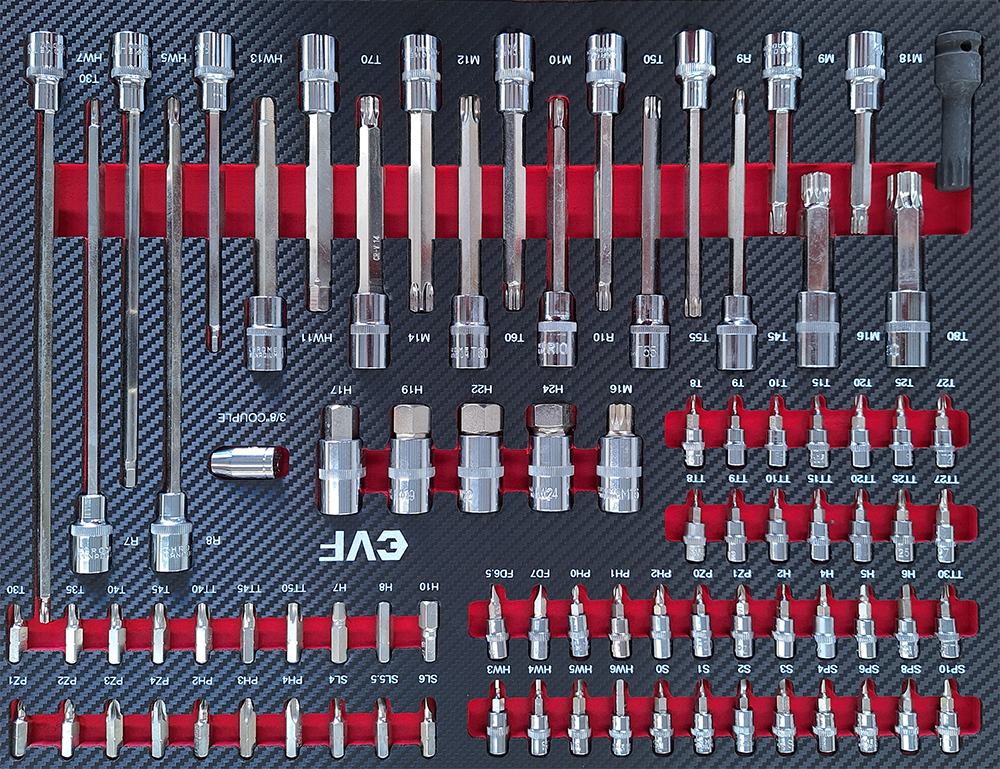 - Cajón 2: Accesorios Carraca 1/4″ pulg: – Vaso interior TX sin agujero – ( T8,T9,T10,T15,T20,T25,T27,T30,T40 ) – Vaso interior TX con agujero – (TT8,TT9,TT10,TT15,TT20,TT25,TT27,TT30, TT40) – Vaso hexagonal – ( H3 a H8 ) – Vaso ranurado – ( SL4 a SL7 ) – Vaso en cruz – ( PZ0 a PZ3, PH0 a PH3 ) – Vaso multidentado – ( M8,M10,M12 ) – Vaso cinco estrellas – (TS10,TS15,TS20,TS25,TS27,TS30,TS40,TS45,TS50) Accesorios Carraca 3/8″ pulgadas: – Accesorio para puntas – Tuercas TX interiores sin agujero – ( T40,T45,T50,T55,T60,T70) – Tuercas TX interiores con agujero – (TT40,TT45,TT50,TT55,TT60,TT70) – Tuercas hexagonales interiores – ( H7,H8,H10,H12,H14 ) – Tuercas ranuradas – ( SL8,SL10,SL12 ) – Tuercas en cruz – ( PZ3,PZ4, PH4,PH8 ) Accesorios Carraca 1/2″ pulgada: – Enchufe hexagonal corto (H14,H17,H19,H22,H24) Multidiente M16 – Enchufe hexagonal medio (H5,H10,H11,H13 ) TX (T40,T45,T50,T55,T60,T70,T80) Ribe (R9, R10) Multidiente (M9,M10,M12,M14,M16,M18) – Enchufe largo TX (T30,T45,T50) Enchufe hexagonal H7