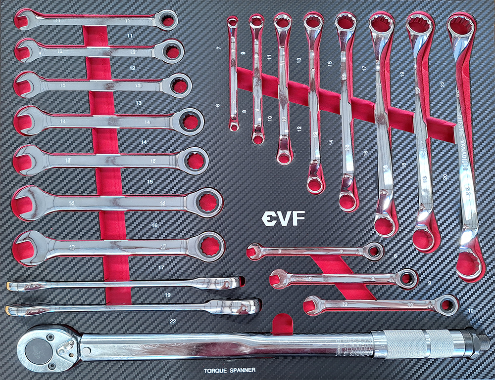 Las herramientas incluidas en el carro de taller se componen de acero al cromo vanadio y se almacenan en insertos de espuma de poliestireno.
