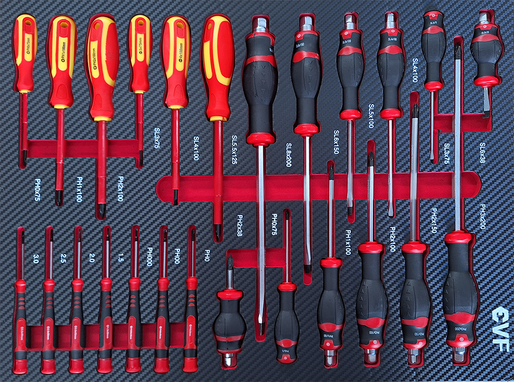 - Cajón 4: Destornilladores de ingeniería de precisión ranurados: SL3.0 x 100mm en cruz : PH0 x 100mm – Destornilladores con mango blando y hexágono exterior: ranurados: SL6 x 38mm ; SL5 x 75mm ; SL6 x 100mm ; SL8 x 150mm en cruz : PH2 x 38mm ; PH1 x 75mm ; PH2 x 100mm ; PH3 x 150mm – Destornilladores TX-:: T6 x 80 ; T7 x 80 ; T8 x 80 ; T9 x 80 ; T10 x 80 ; T15 x 100 ; T20 x 100 ; T25 x 100 T27 x 100 T30 x 100 ; T40 x 150 Mangos de herramientas gris negro.