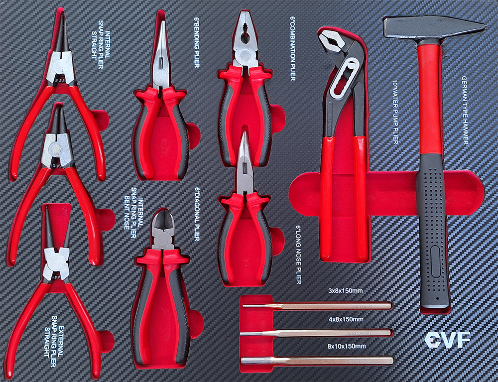 - Cajón 6: Juego de alicates para anillos interior/exterior 4pcs ( 2x doblados , 2x grado ) – Juego de alicates : ( alicates combinados , alicates de corte lateral , alicates de punta de aguja de grado , llave de tubo ) – Martillo